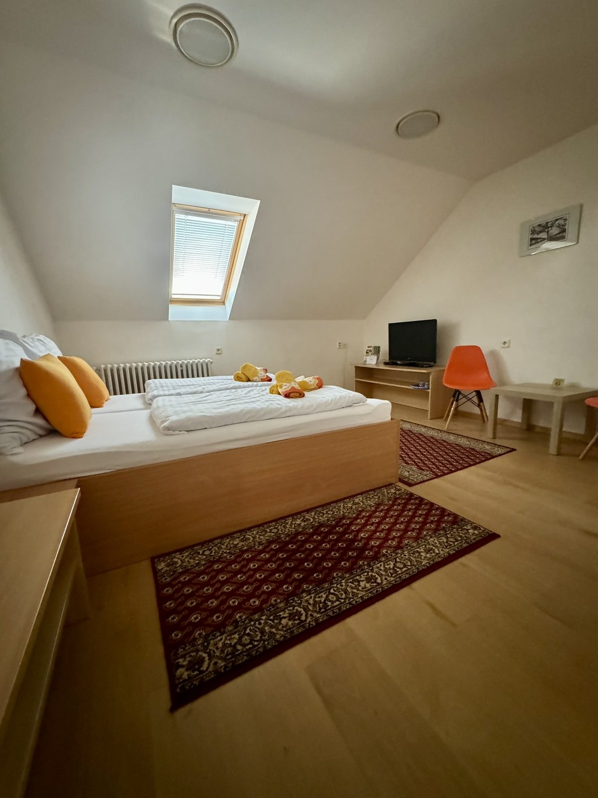 Dva dvoulůžkové pokoje v podkroví, vlastní koupelna přes chodbu. Vhodné pro rodinu nebo menší skupinu.