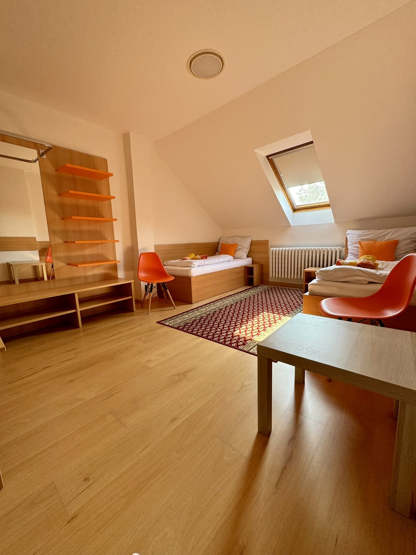 Jednolůžkový a dvoulůžkový pokoj v podkroví s vlastní koupelnou se sprchou a WC pro tyto dva pokoje.